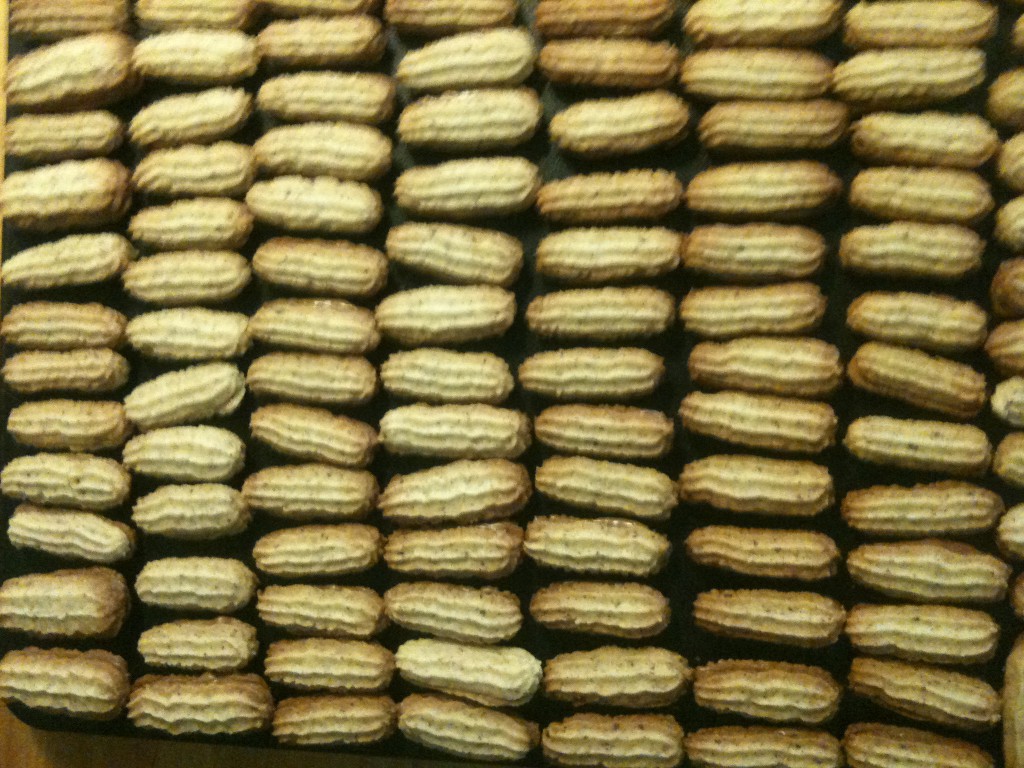 - 130 Gramm gemahlene Nüsse ebenfalls unterheben, mit Spritzbeutel ca. 4cm lange Stangen aufs Blech spritzen und bei 180°C für ca. 10 Minuten backen, anschließend mit