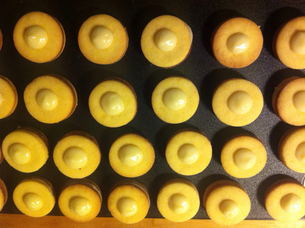- 60 Gramm Butter zu einem Mürbteig verkneten, runde Plätzchen ausstechen und bei 200°C für 7-10 Minuten backen, während dessen die Fülle vorbereiten: