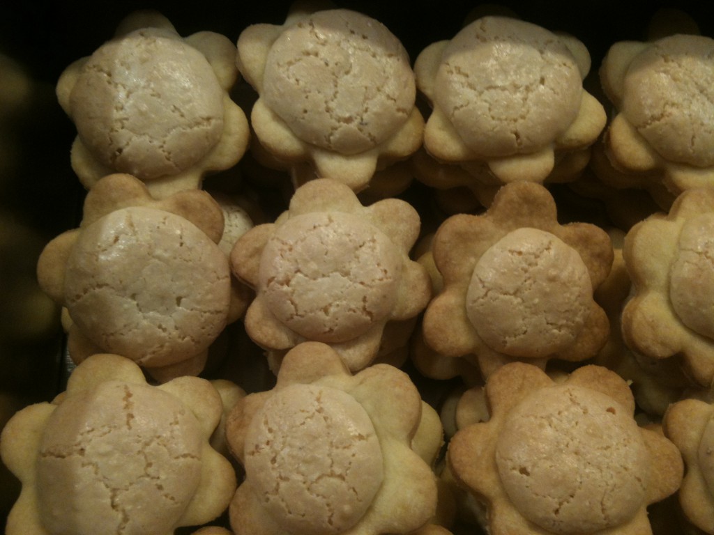 - 250 Gramm Mehl hinzufügen und zu einem glatten Teig verkneten, kalt stellen, dann Ringe/Sterne ausstechen und Makronenmasse herstellen: