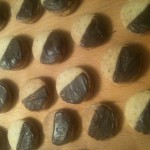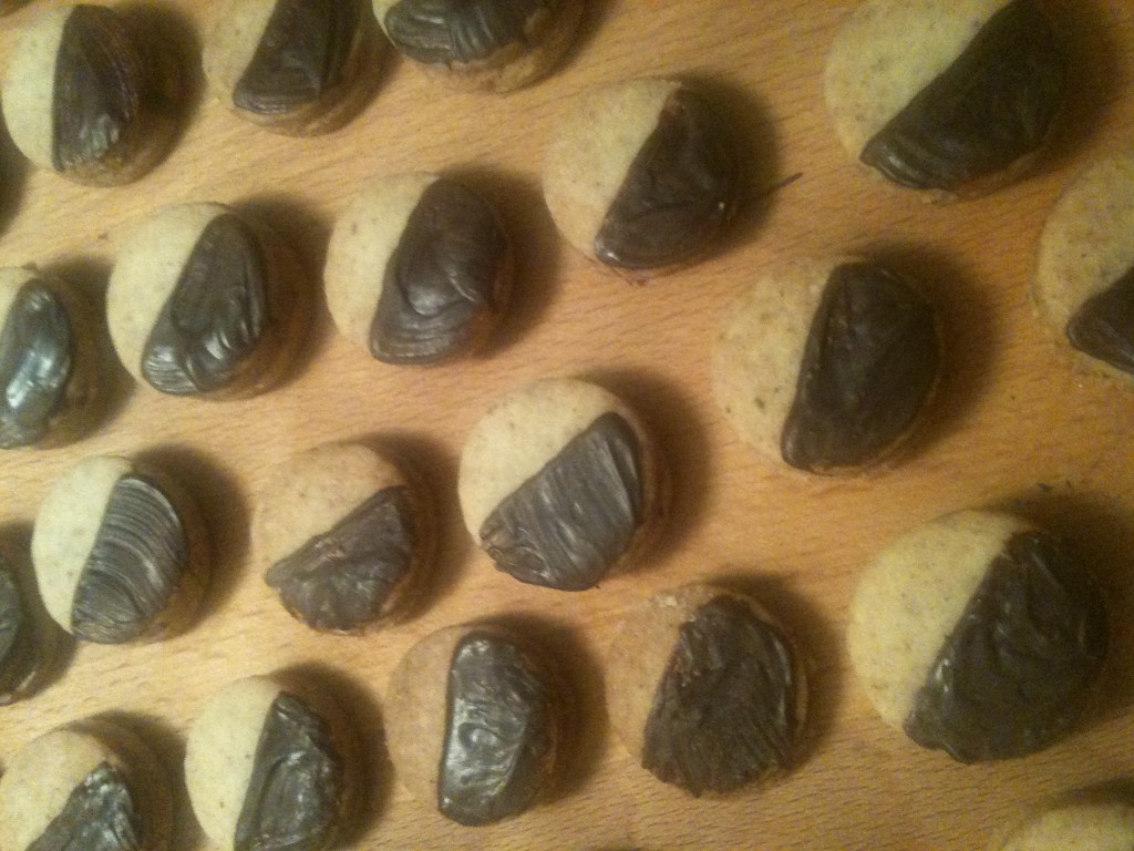 - 200 Gramm Nougat erwärmen und je 2 Plätzchen damit zusammenkleben und die Kekse mit